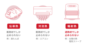 直接触れることで熱が伝わる「伝導熱」、風や空気によって運ばれる「対流熱」、赤外線で伝わり風に影響されない「輻射熱」の3種類です。