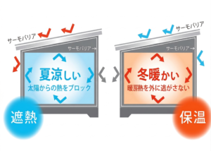 同じ「輻射熱を反射する」という仕組みが、夏は外からの熱を防ぎ、冬は内側の熱を閉じ込めるため、一度の施工で、暑さ対策にも寒さ対策にも効果があるのが大きな特長です。