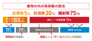 建物内の熱移動の75%は輻射熱ですが、残りの25%は伝導熱や対流熱です。遮熱シートだけでは、全ての熱を100%防ぐことはできないことを理解しておく必要があります。